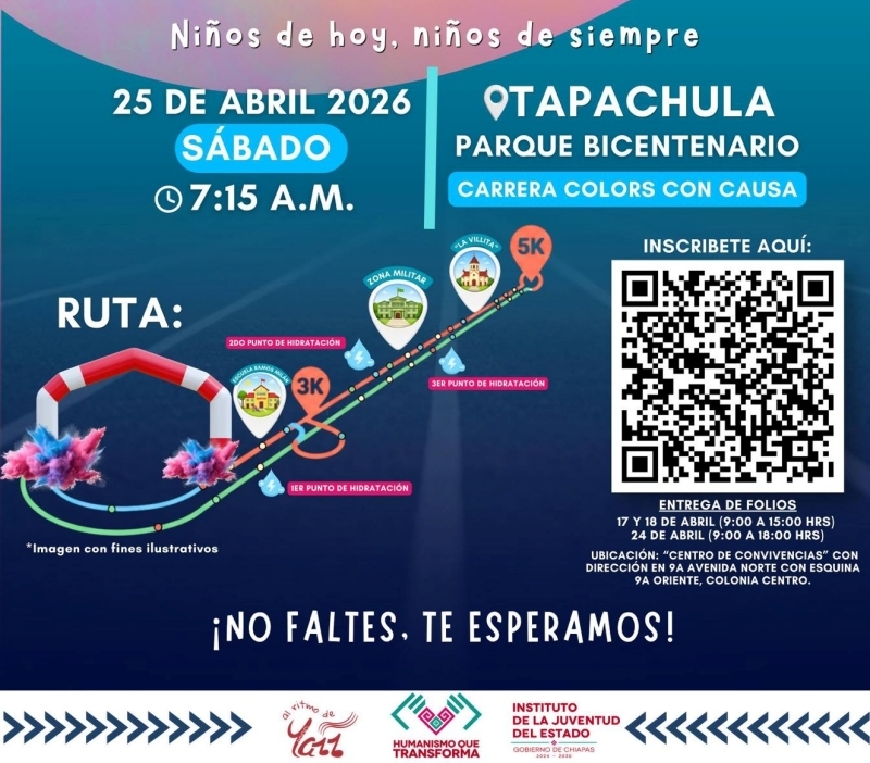 Tapachula, Chis; ABR. 14 (interMEDIOS).– Desde la Secretaría de Juventud y Deporte el Ayuntamiento de Tapachula se sumó a la carrera colors con causa “Ruta Balam Día del Niño y de la Niña 2026”, que encabeza la líder juvenil Yazz Ramírez.