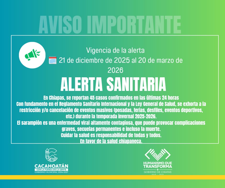 A través de este medio, quiero informar que derivado a la situación epidemiológica que se vive en el país en casos de Sarampión, por indicaciones del Secretario de salud de Chiapas Dr. Omar Gómez Cruz, mediante Oficio IS/DSP/APS/01783/2025; de manera oficial SE CANCELAN EVENTOS MASIVOS como: posadas, ferias, desfiles alegóricos, partidos deportivos entre otros, esto durante la temporada invernal 2025 – 2026 del 21 de diciembre de 2025 al 20 de marzo de 2026 y se extenderá dependiendo de la circulación del virus. Estas acciones son de manera obligatoria por disposición oficial de gobierno del estado.