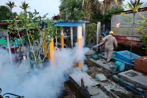 Cacahoatán, Chis; OCT. 30 (interMEDIOS).– El H. Ayuntamiento de Cacahoatán, que preside el Ing. Víctor Pérez Saldaña, en coordinación con el Programa Dengue Zona Frontera de la Jurisdicción Sanitaria No. 7 Tapachula, realiza acciones de rociado y termonebulización en los panteones del municipio como medida preventiva por el Día de Muertos.