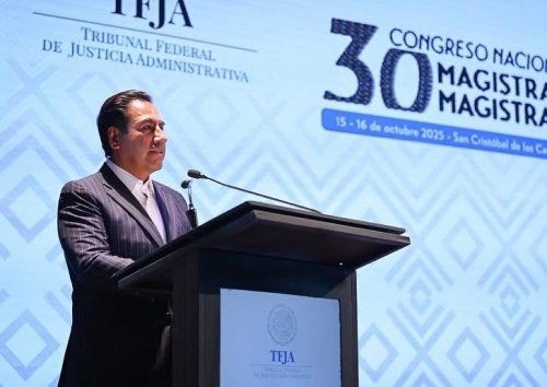 Acompañado del magistrado presidente del TFJA, Guillermo Valls Esponda, el mandatario agradeció que Chiapas fuera elegida como sede de este encuentro nacional, y recordó que la entidad ha sido cuna de grandes juristas como Andrés Serra Rojas, quien estableció que “el derecho administrativo es el derecho del poder limitado por la razón y por la ley”.