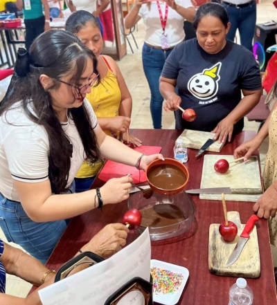 En esta actividad se capacitaron a 28 mujeres, quienes aprendieron técnicas básicas de preparación y decoración de manzanas cubiertas, fomentando la creatividad, el trabajo colaborativo y el desarrollo de habilidades productivas que pueden convertirse en una fuente de ingreso para ellas y sus familias.