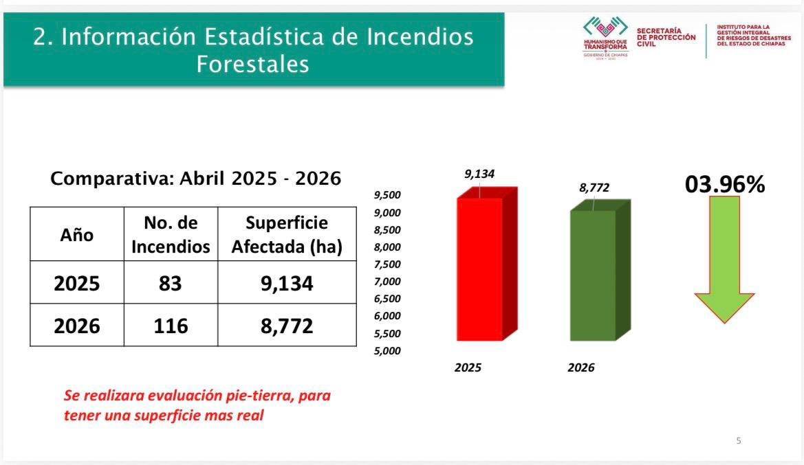 Tuxtla Gtz, Chis; ABR. 16 (interMEDIOS).– La Secretaría de Protección Civil del Estado presenta la actualización del panorama de incendios forestales en la entidad. Gracias a la estrategia de detección temprana y combate oportuno, este año registramos una reducción del 3.96% en la superficie afectada en comparación con el mismo periodo del año anterior. 📉✨
