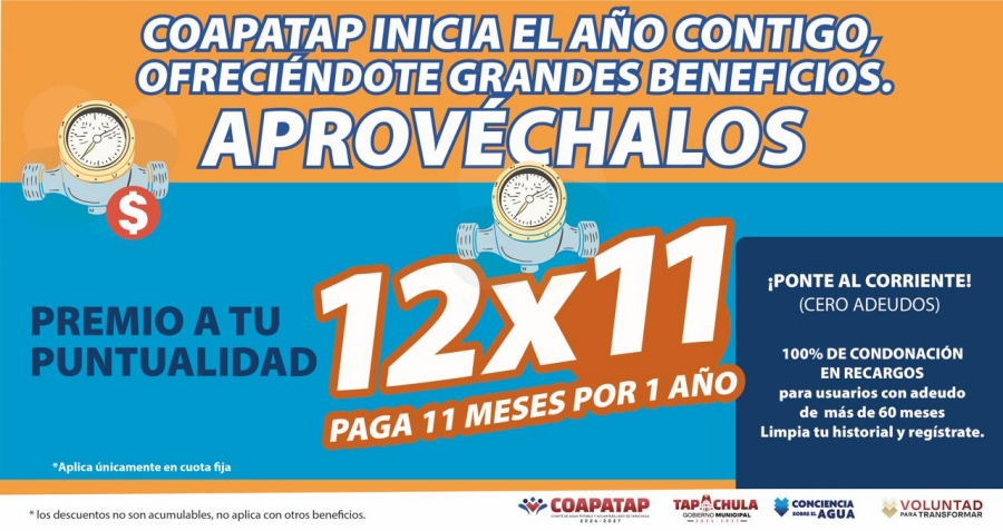 Tapachula, Chis; ENE: 15 (interMEDIOS).– En apoyo a la economía familiar, el Comité de Agua Potable y Alcantarillado de Tapachula (COAPATAP) inicia el año contigo, ofreciéndote grandes beneficios para que regularices tu servicio de agua potable y cuides tu economía. ¡Aprovéchalos!