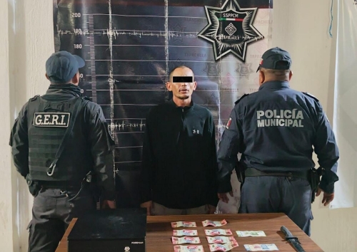 Al arribar al lugar, elementos municipales ingresaron al establecimiento y realizaron el aseguramiento inmediato del individuo, a quien se le encontró en posesión de dinero en efectivo y el arma utilizada, asegurando también los indicios conforme a protocolo.