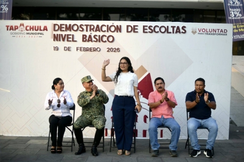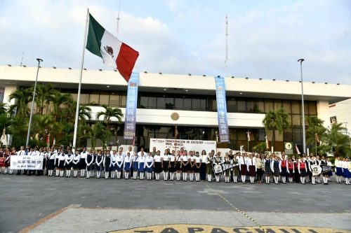 Tapachula, Chis; FEB. 22 (interMEDIOS).– En seguimiento a la estrategia que fortalece la identidad nacional y el respeto a los símbolos patrios, el Ayuntamiento de Tapachula a través de la Secretaría de Educación y Cultura Municipal, realizó en la explanada del parque central Miguel Hidalgo la Demostración de Escoltas y Bandas de Paz, con la participación de diversas instituciones educativas.