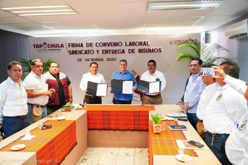 Tapachula, Chis; DIC. 26 (interMEDIOS).– El presidente municipal, Yamil Melgar, encabezó la firma del convenio laboral con el Sindicato Único de Trabajadores al Servicio del Municipio, en un marco de diálogo, respeto y comunicación constante.